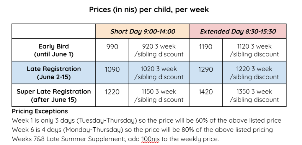Session 5 will have an additional fee of 100nis (The late summer supplement helps us to show appreciation to our staff – Its not easy to find such amazing educators that are willing to work the last weeks of summer.