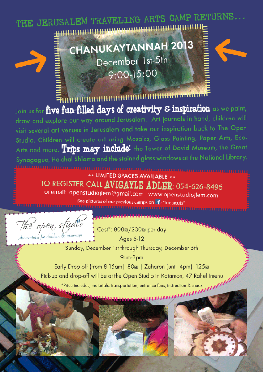 Weekly registrants receive a sketch book and various art media to work with on tiyulim, snack and entrance fees included. Please pack a lunch, a smile, and your childs “rav kav”.